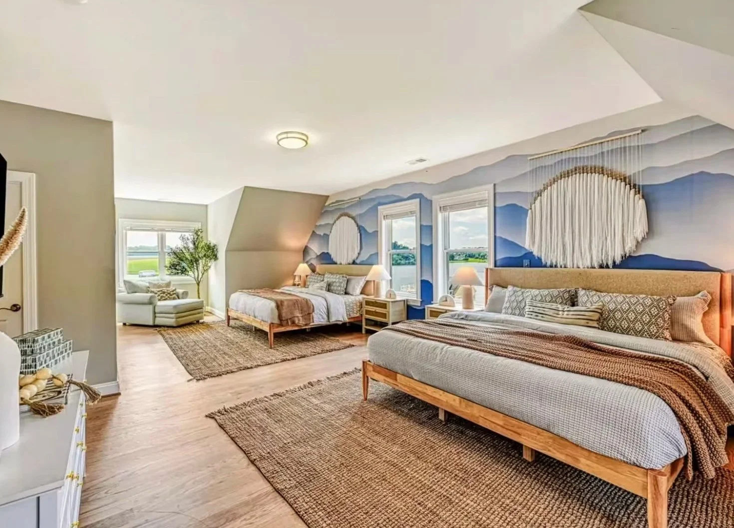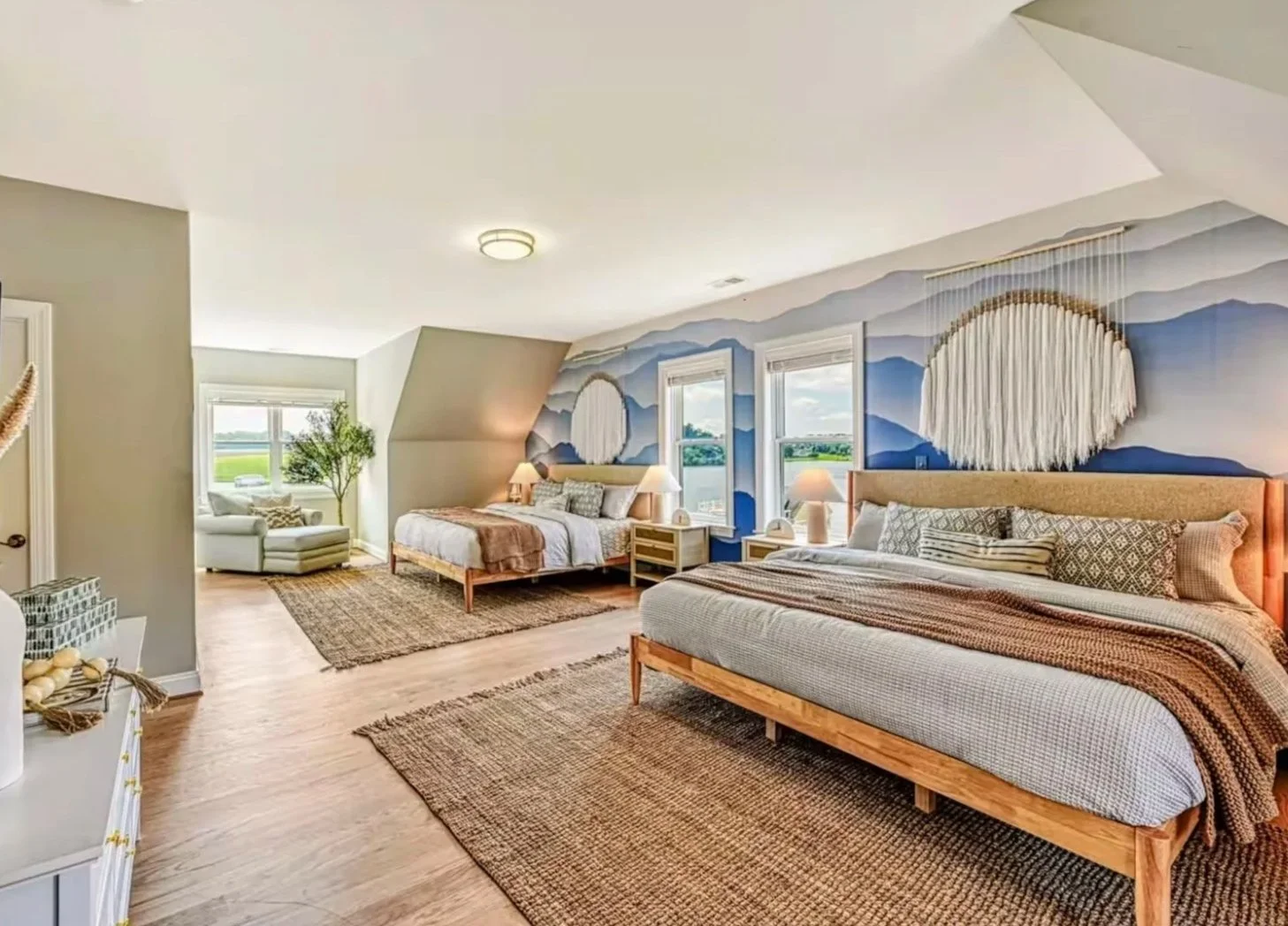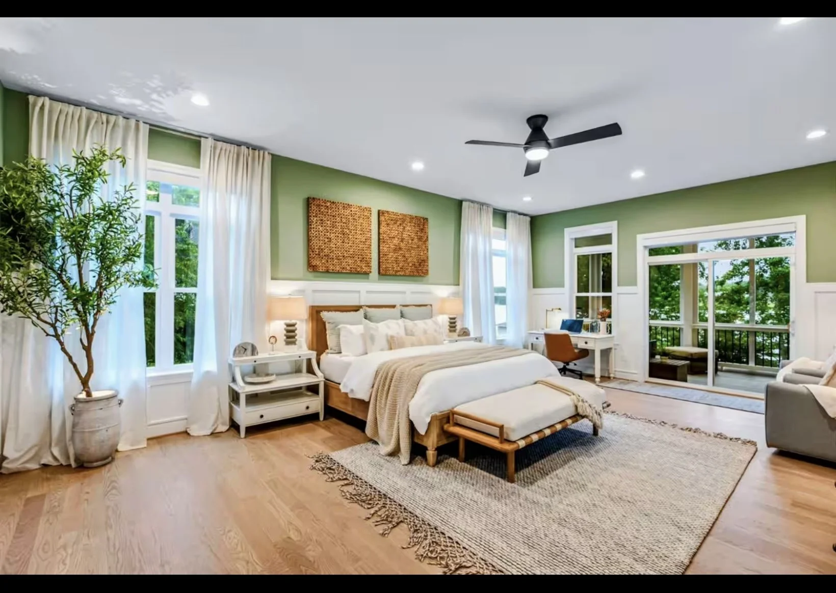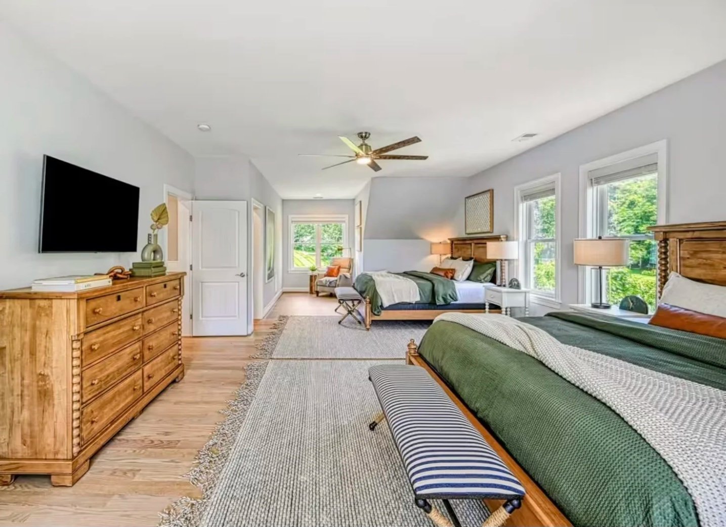 The primary suite Offers a private screened patio, desk and workspace, private screened porch entrance, an en suite bathroom with soaking Jacuzzi tub.